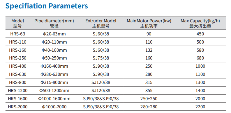 Капацитет: Једнократни екструдер, погодан за прераду високих капацитета ПЕ смола, са максималним капацитетом од 1000 кг / х. Пречник: од 16 до 800 мм. Усвајање разумног дизајна и апсорбирањем сигурне производне технологије, добио је ЦЕ и ИСО сертификате
