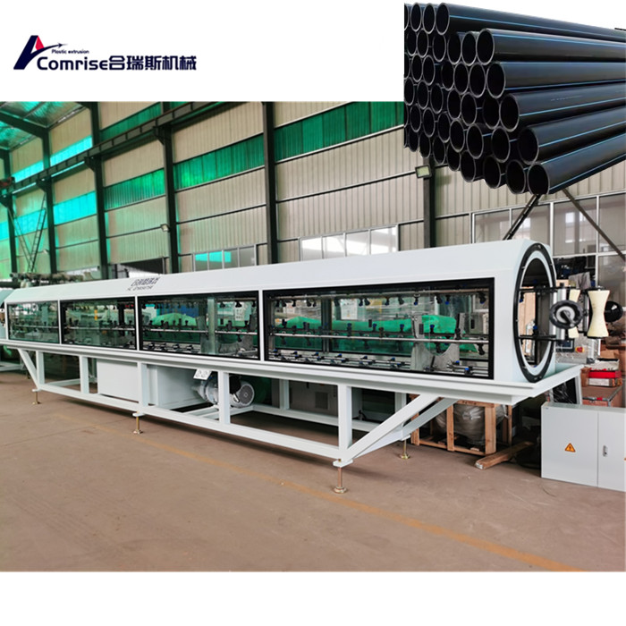 Једнократни екструдер + ЦО екструдирање машине + цеви калуп + кутија за димање вакуумског димензионисања + расхладна кутија за распршивање + шест вилица трактор гусеничар + машина за резање чипа + превртање сталак.
